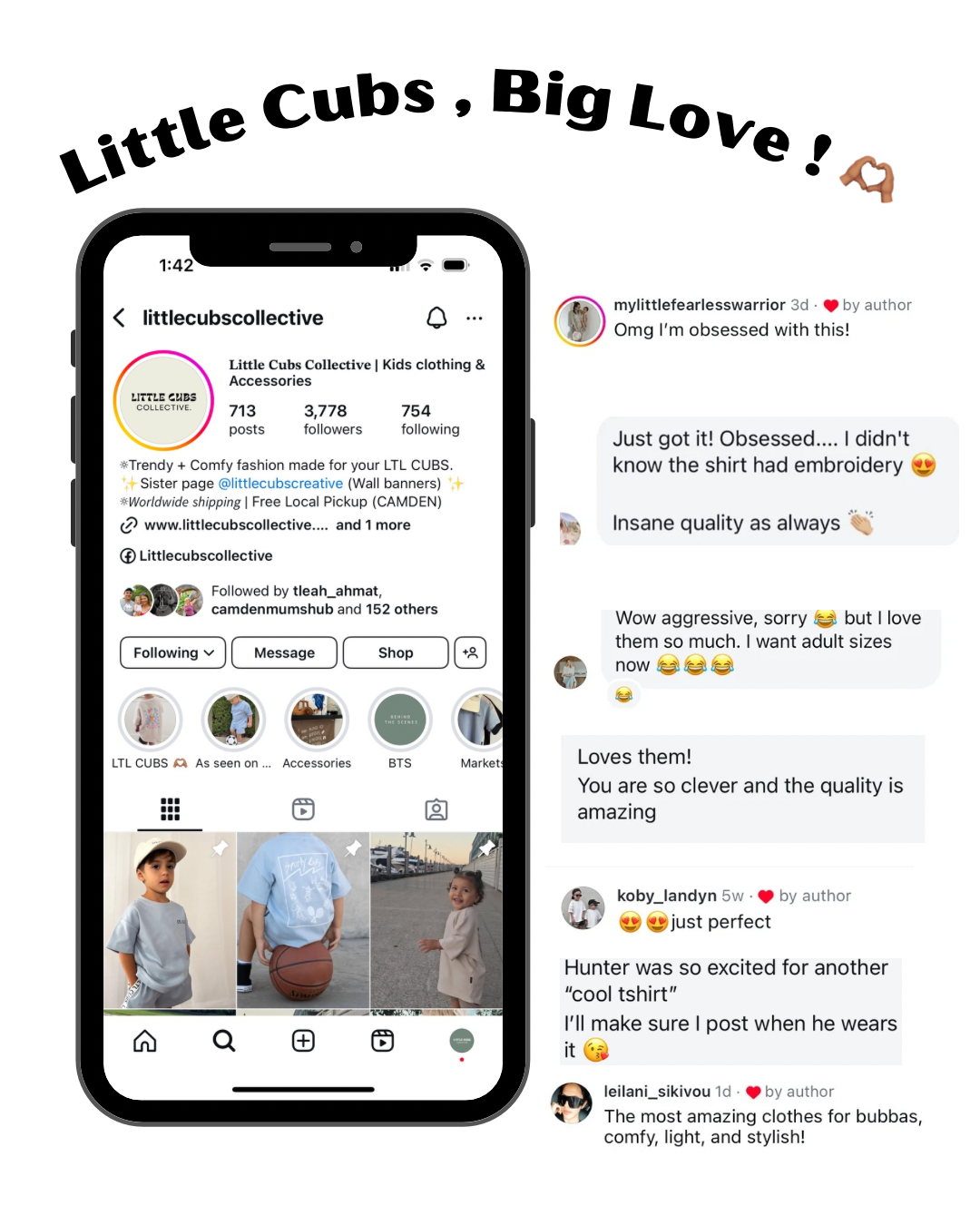 Little Cubs Collective is more than just a brand- it's a community, created by a mum of three little cubs who knows firsthand the magic, joy and chaos that childhood brings. I've felt the highs, the challenges and everything in between, which is why I designed pieces that spark conversations, turn heads and connect like - minded mums who just get it.